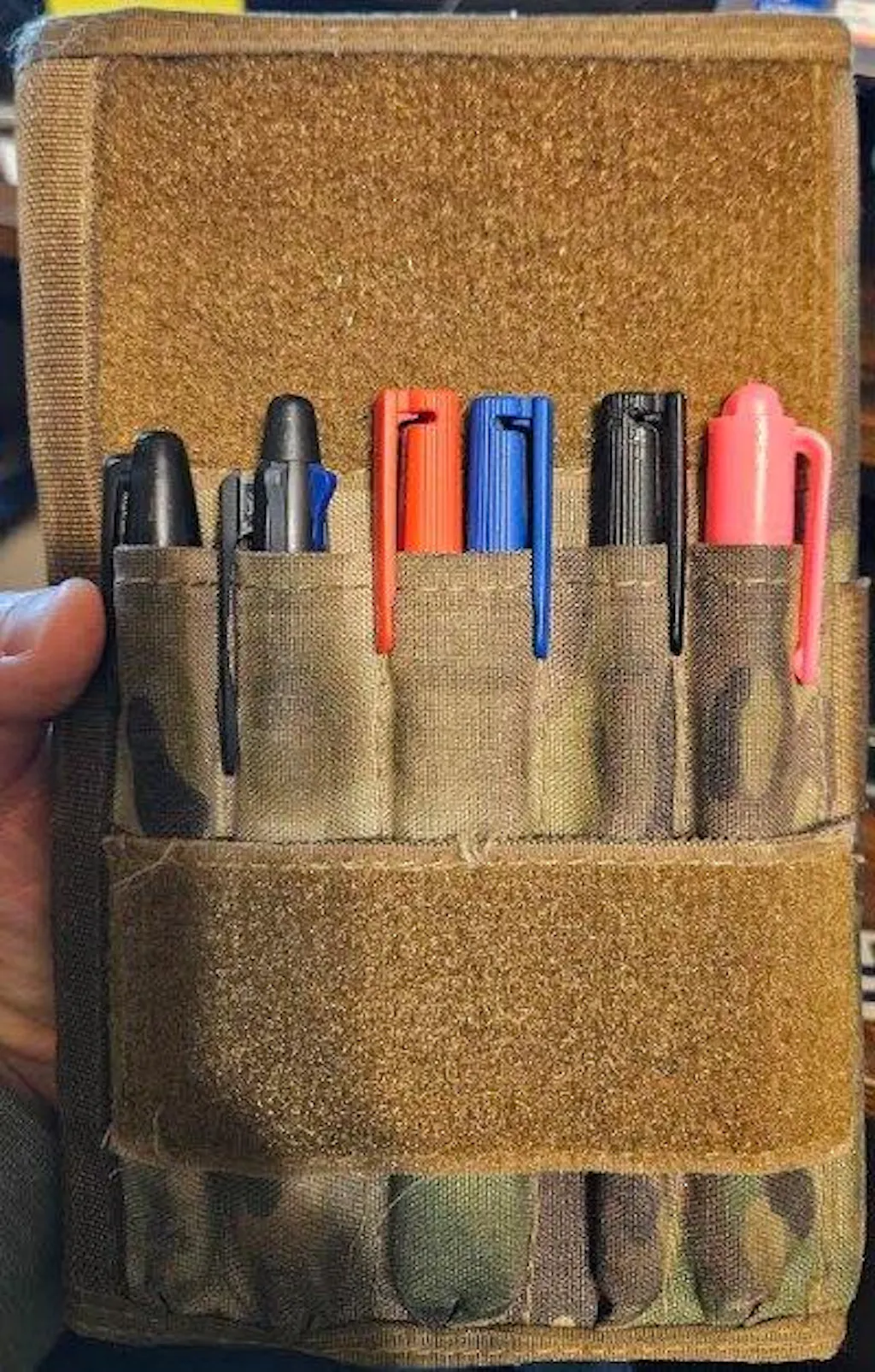 ✅ FRONT - The front side of this cover has a large loop fastener area, which can be used to customize with our Detachable Accessories, or for attaching patches. Loop fastener area is 4.5” wide x 7.5” tall. Cover is securely closed with a 1.5 nylon web strap. On the front of the cover situated over the pen slots is a utility strap designed to snugly hold items like a cell phone, calculator, small notepad etc. Also with Loop Fastener (2 x 4.75in.) over the utility strap, allowing for additional patches.